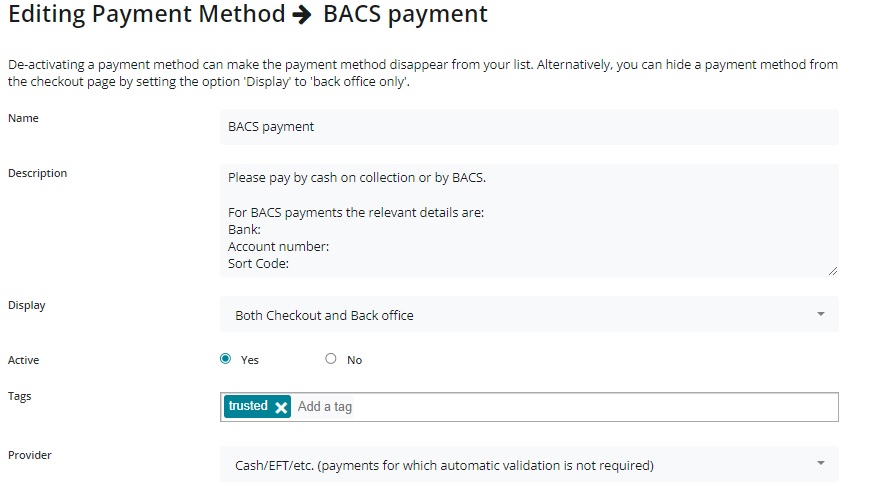 Create a second payment method with the following settings: Name: ‘Cash or BACS payment’ Description: provide relevant details here such as bank information required for a trusted customer to make direct payment to your bank account Display: Both checkout and back office Active: yes Tags: ‘trusted’ Provider: Cash/EFT/etc