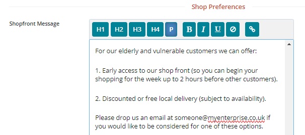 Don’t forget to edit your ‘Shopfront Message’ (found from Enterprises -> Settings -> Shop Preferences) to invite new elderly/vulnerable/keyworker customers to contact you so they can be prioritised.