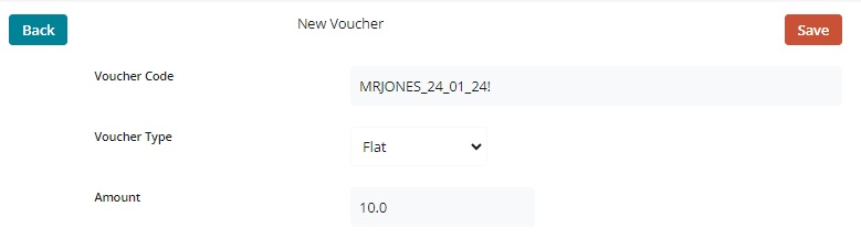 Complete the form: Voucher Code: Choose a unique string. We suggest adding special characters and perhaps dates or numbers to prevent vouchers being misused. Voucher Type: Flat Amount: monetary value of the gift voucher purchased.