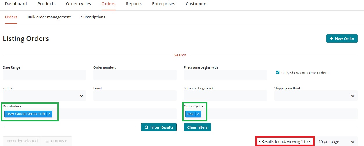 Visit Orders in your admin panel and filter results by distributor and order cycle (highlighted in green below). The number of orders received is shown under the 'Filter Results' heading (highlighted in red).