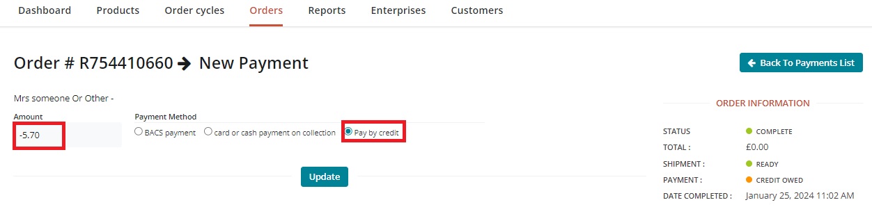 Enter the amount of the order paid that has been 'paid by credit' preceded with a minus sign (i.e. -£5.70) and choose ‘Pay by Credit’, then ‘Update’.