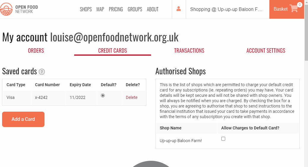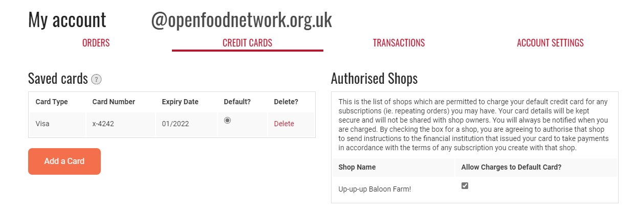 If you would like to pay for your subscription order by card then it is necessary to add and save a card to your OFN account and tick the box to ‘Allow Charges?’ to the shop you would like the subscription with: